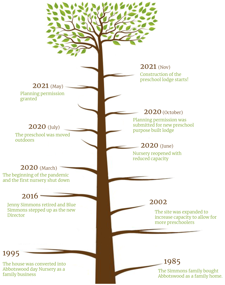 Bought by the Simmons family in 1985, Abbotswood was a much loved family home to 4 children, one of which had substantial additional needs (SEN). The home was developed into the day nursery in 1995 by mum, Abbotswood founder, Jenny Simmons, and was slowly extended. The nursery has consistently achieved an Ofsted ‘GOOD’ grading since it’s registration.